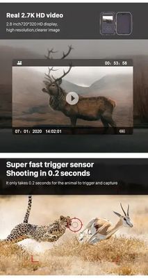 [HD 2.7K Video Resolution & 20MP Clear Image] The trail camera can capture 20MP images and HD 2.7K videos, providing you a vivid world of wildlife during the day(color) and night(black and white). The resolution of the image and video is switchable.